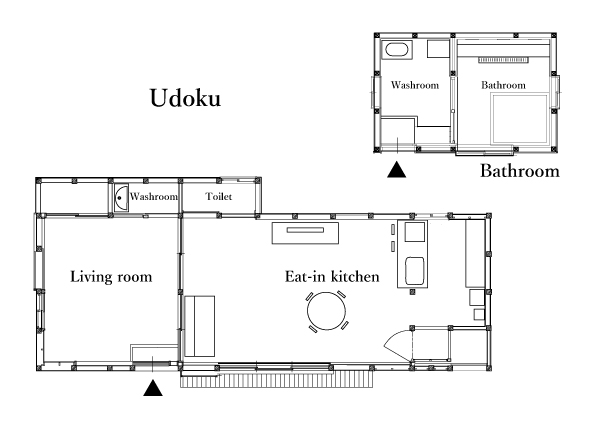 "Udoku" is a building that was a "retirement house" out of the two buildings, and the interior is a compact structure with a dining room and a sleeping room equipped with an island kitchen. another building has a large bath for the whole family.