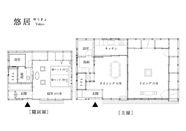 | 間取り | ・主屋:ダイニングキッチン(12畳間) / リビング(15畳間、囲炉裏つき) / 洗面室 / トイレ / 浴室 ・隠居屋: ベッドルーム [ シングル1+セミダブル1 ](12.5畳間) / 洗面室 / トイレ / 浴室 |