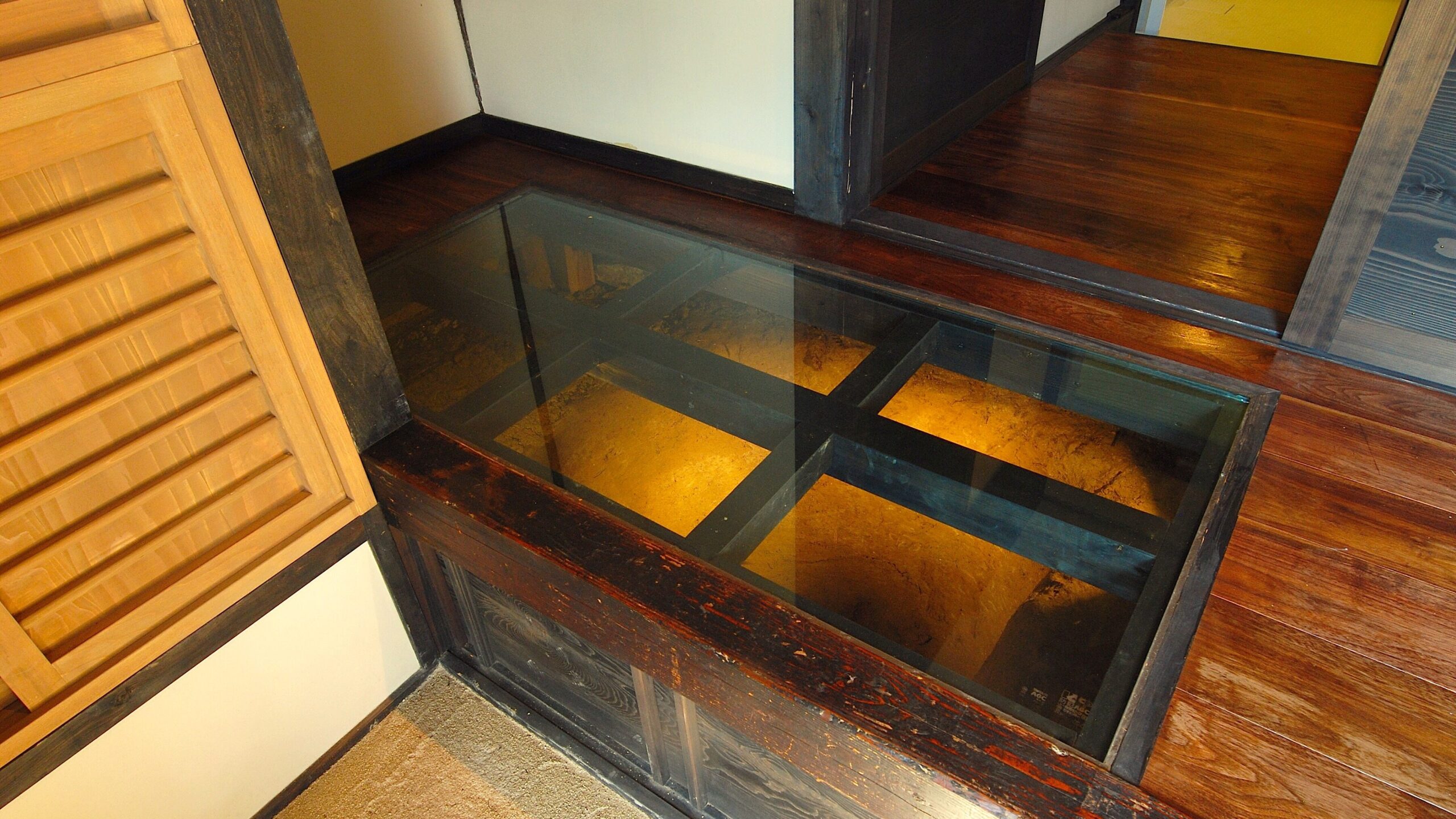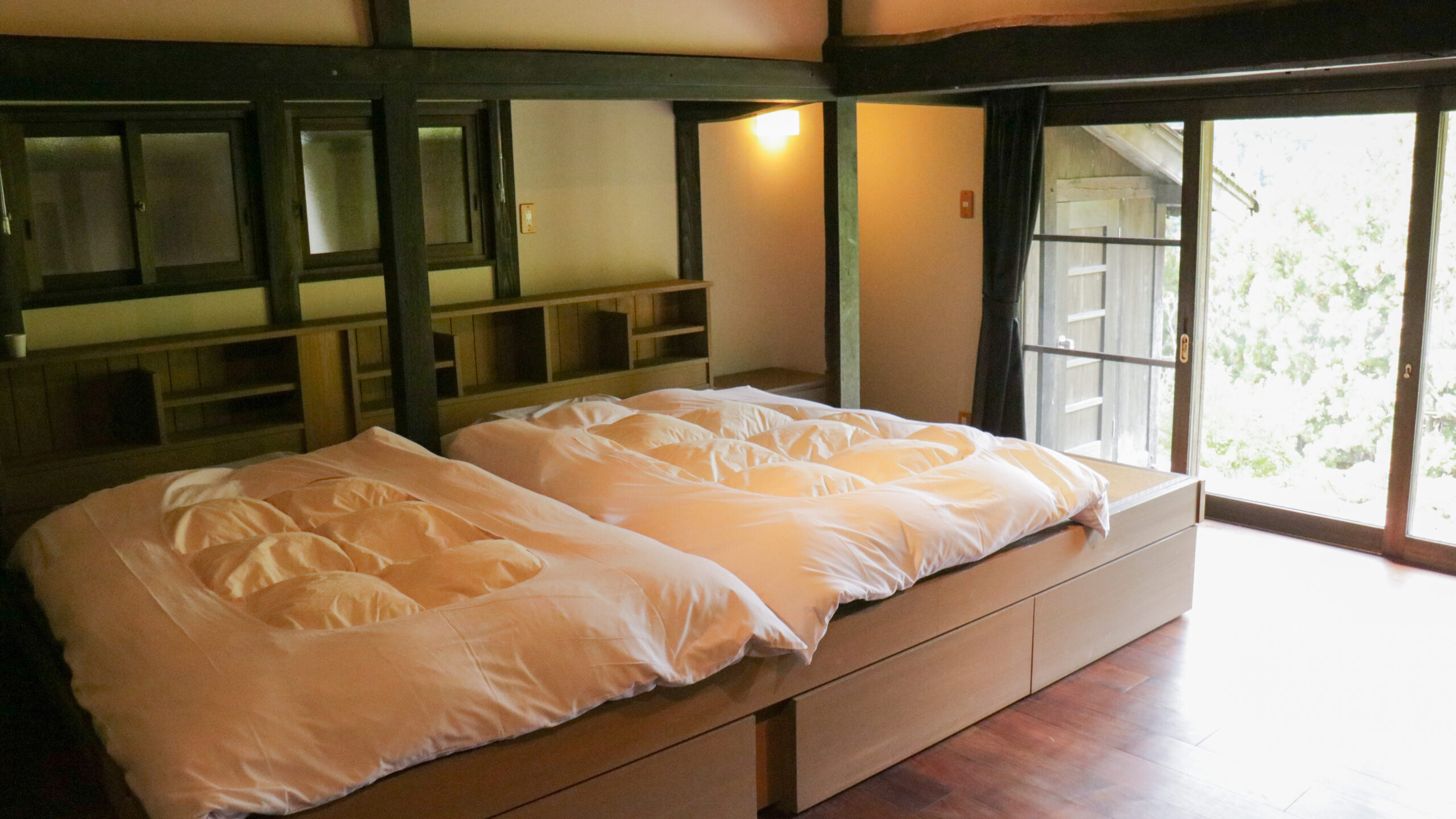 隠居屋には和モダンなベッドがあり、隠居屋の入り口をあがった床はガラスで、芋つぼと呼ばれる貯蔵庫が見え、昔の暮らしぶりが伺えます。