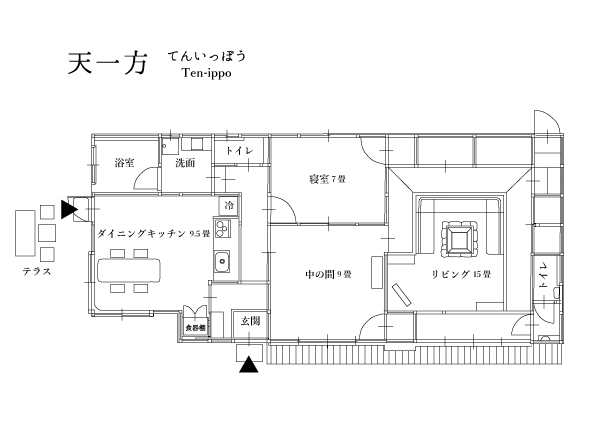 | 間取り | ダイニングキッチン(9.5畳間、土間) / リビング(15畳間) / ナカノマ(9畳間) / ネマ(7畳間) / 洗面室 / トイレ×2 / 浴室 |